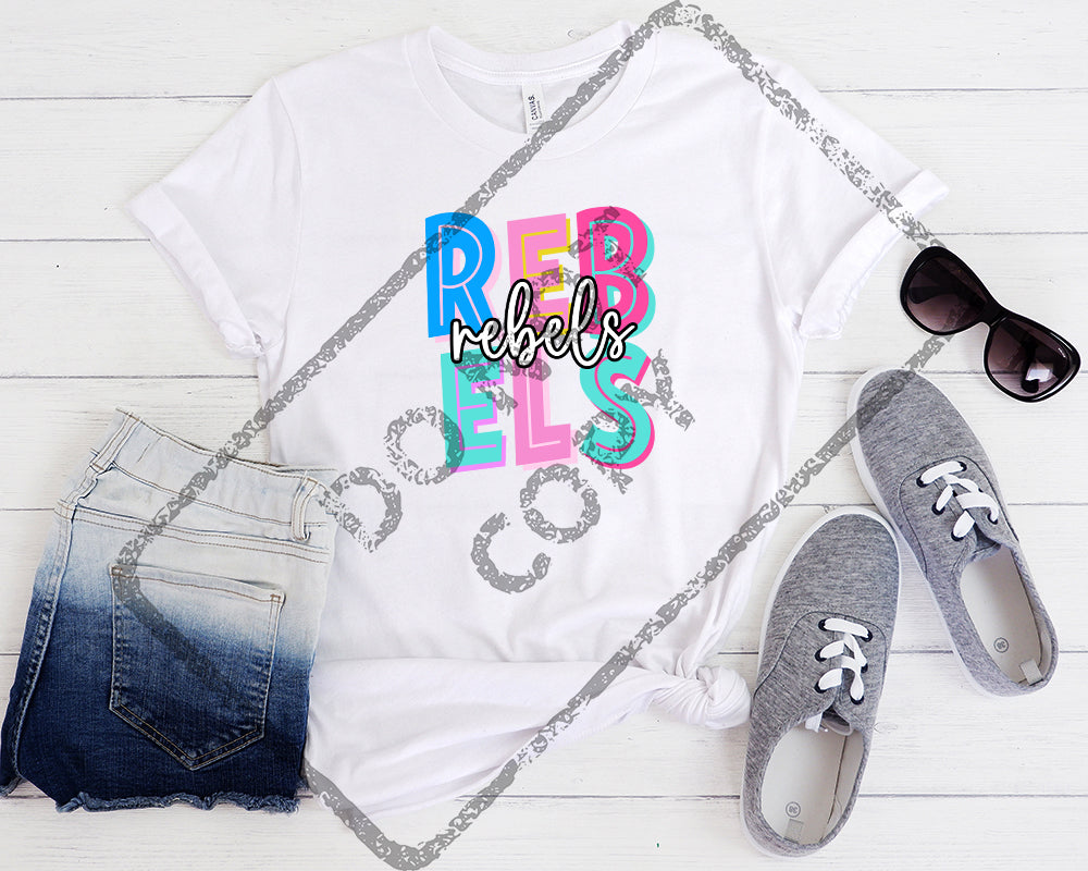 Script and Block School Mascot REBELS DTF Transfer in infant, youth and adult