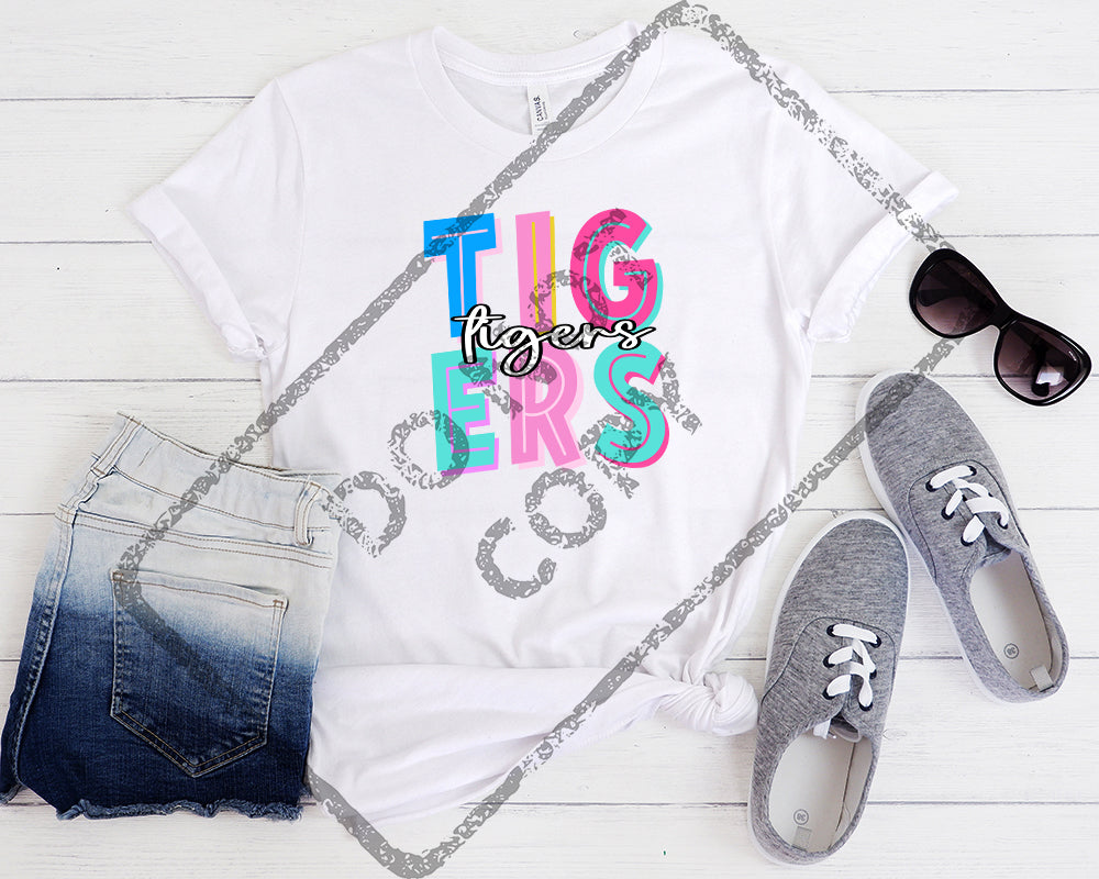 Script and Block School Mascot TIGERS DTF Transfer in infant, youth and adult