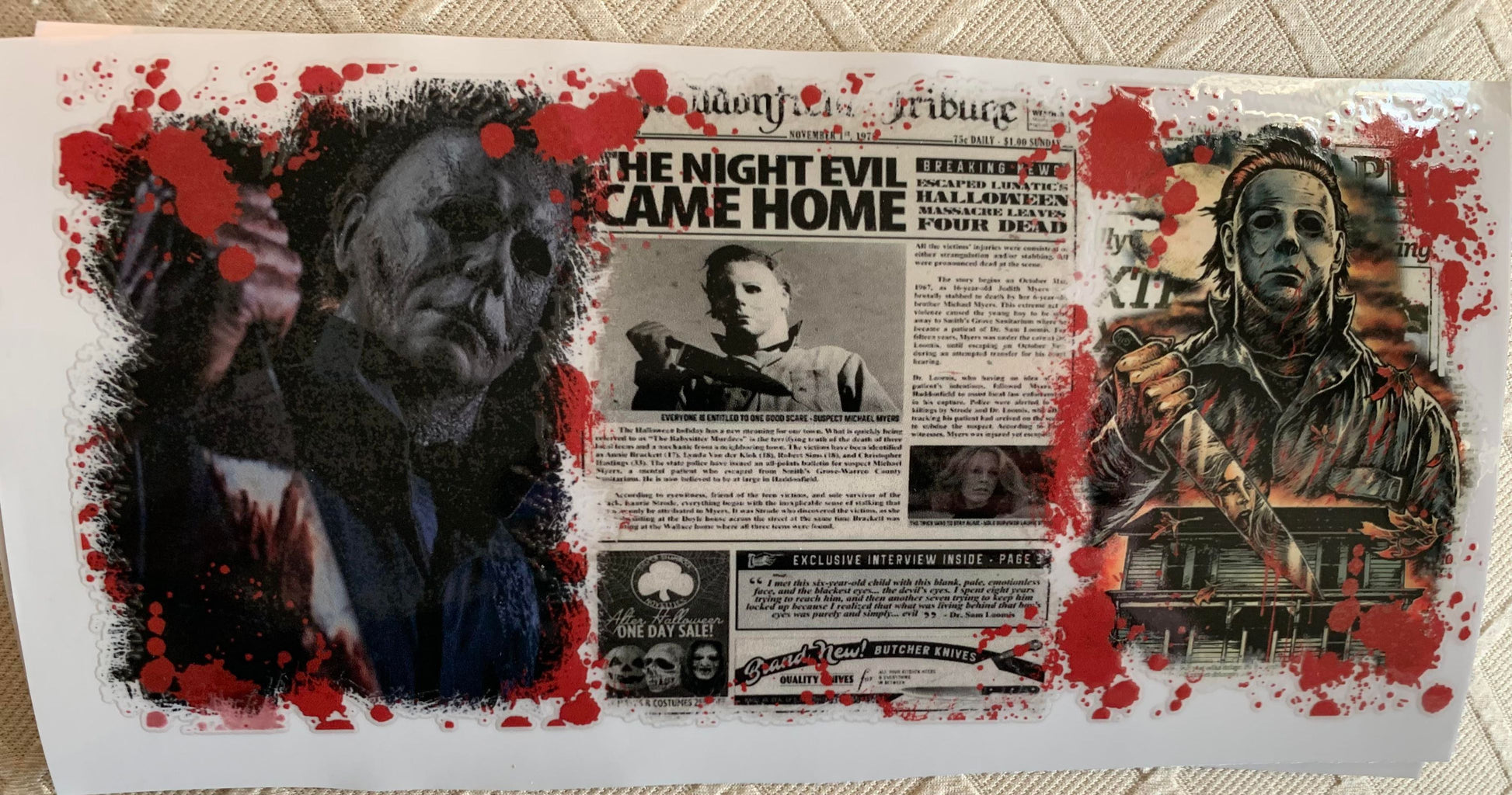 UV DTF Printed Sticker wrap for 16oz Libby glass- Halloween Jason Newspaper